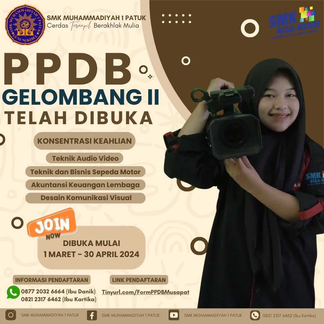 Musapat News ----- Kesempatan pendidikan yang berkualitas kembali dibuka lebar dengan dibukanya gelombang kedua Penerimaan Peserta Didik Baru (PPDB) tahun 2024 di SMK Muhamamdiyah 1 Patuk. Mulai tanggal 1 Maret hingga 30 April 2024, siswa-siswi yang memiliki impian untuk menjalani pendidikan tinggi dapat mendaftar dan memilih jurusan sesuai minat dan bakat kalian.